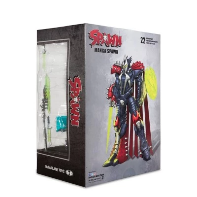 - Manga Spawn comes with a Todd McFarlane signed nameplate, a sword, a spear, an axe, an arm blade, a shield, two daggers and a base